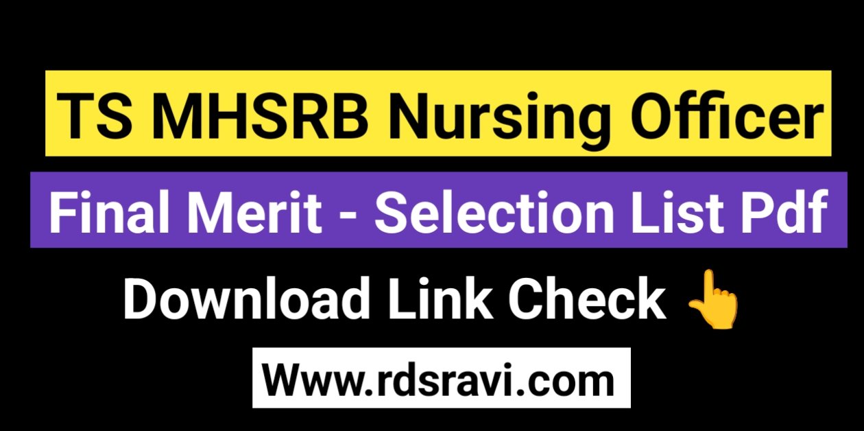 TS MHSRB Nursing Officer Final Selection List 2026 : TS MHSRB Nursing Officer Final Selection List 2026 will be declare on same day of result date, so you can visit rdsravi.com regularly for latest update, also Merit List Download Link are given below.